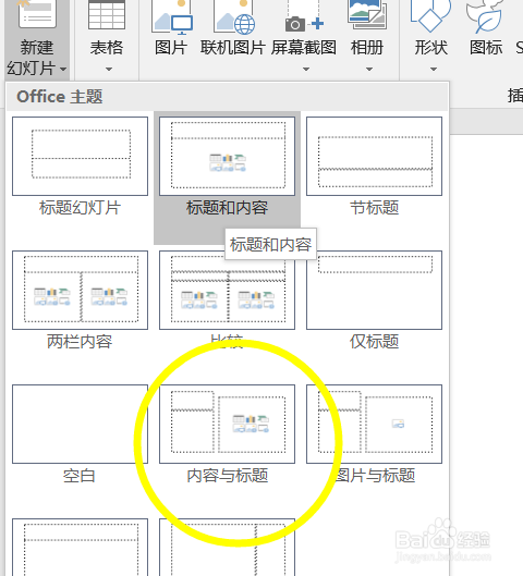 新建之后我们这里选择内容和题目的幻灯片让大师看的更细心,除了空白其他你都可以选择,我们往内容里面先输入文字。