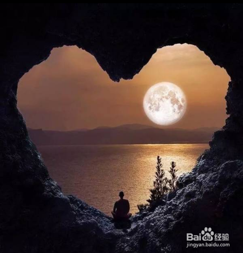 在洞里,从里面往外面拍摄,当月亮达到位置后拍摄,人就坐在洞口。