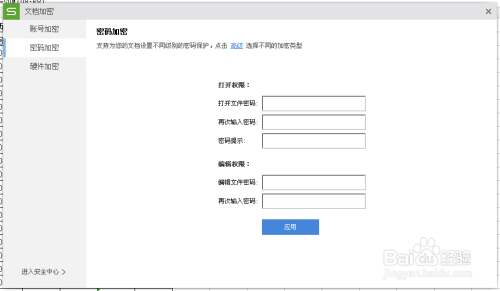 或者直接在上一级页面内点击“文档加密”选项奶奶个,在右侧菜单内选择“密码加密”。弹出图二页面,输入密码。