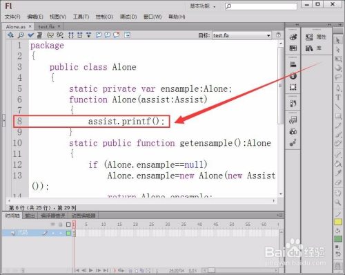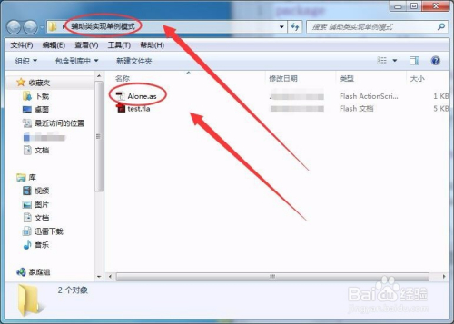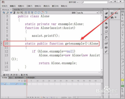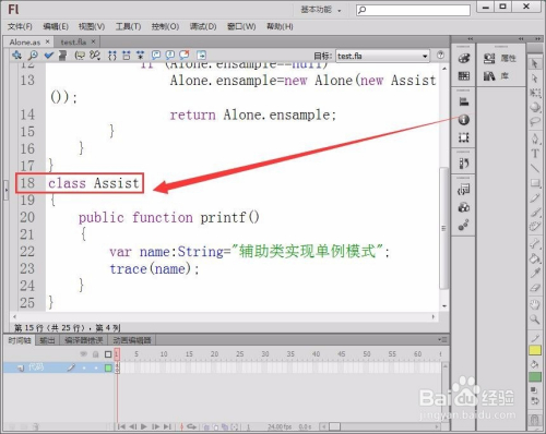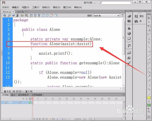 首先,建立一个类文件Alone.as,保留在固定的文件夹中,本例为“辅助类实现单例模式”。