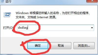 在红色线框中输入“dxdiag”,然后点击“确定”按钮或直接按住enter键,如图所示: