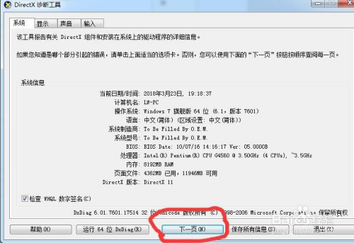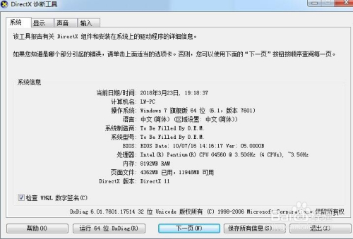 在打开的DirectX诊断东西,可以显示“系统”,“显示”,“声音”,“输入”等相关的信息,默认显示的是“系统”的信息,如图所示: