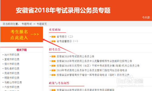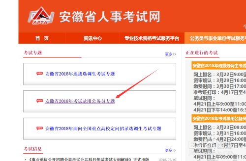 进入安徽省公事员办事平台首页后直接点击【安徽省2018年测验录用公事员专题】,如下图所示。