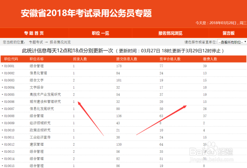 在打开的安徽省2018年测验录用公事员报名环境浏览选项卡里就可以看到职位代码、职位名称、招录人数、提交信息人数、资审及格人数、缴费人数等具体信息了,如下图所示。