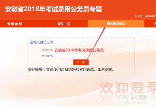 进入安徽省2018年测验录用公事员专题考生报名页面后直接点击导航上面的【报名环境浏览】,如下图所示。