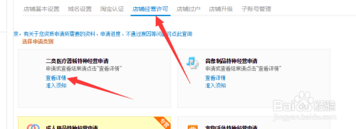 店肆办理进口在页面的左侧,找到店肆办理下的经营许可即可