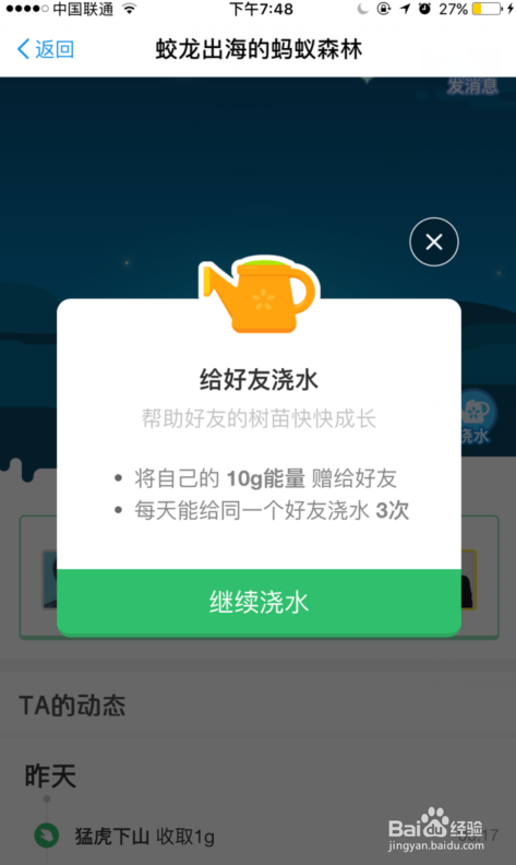 第四:我们除了盗取能量,我们还可以请老友帮手浇水,也是获取能量的方式之一,一个老友天天最多可以浇水三次,也就是一个好只能天天给你3克的能量。