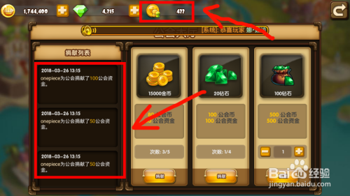 进入公会年夜厅捐募界面,点击公会本身下面的【捐募】按钮,进行捐募,可获得公会币,如图: