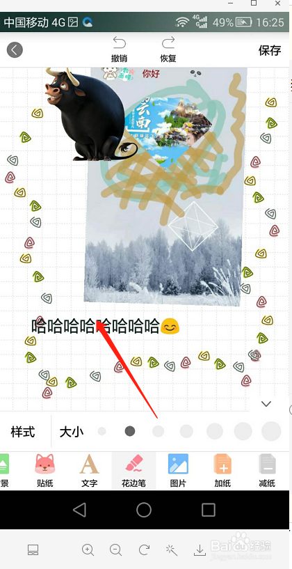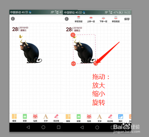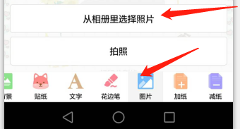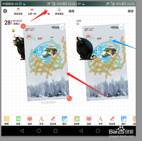 当然我们也可以点击图片,把本身的手机相册里的图片或者素材上传到多彩手帐中来用,我们点击上方下移一层,然后在空白处点击一下就好