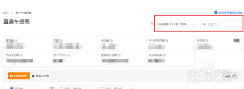 此时我们就可以清楚的看到报表数据了,点击如图红色方框区域,我们可以选择“转化周期”和“数据周期”,一般环境我们都选择“15天累计数据”和“曩昔7天”的数据