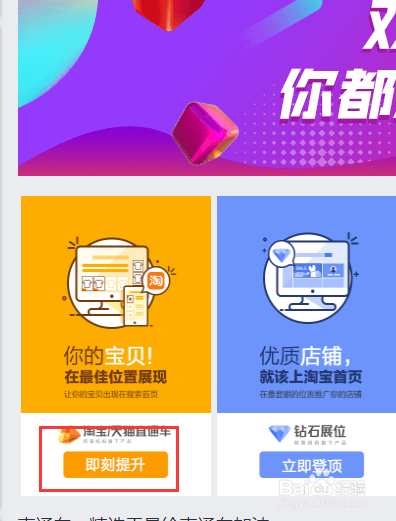 在“营销推广中间”页面,点击“淘宝/天猫纵贯车”下方的“即刻晋升”
