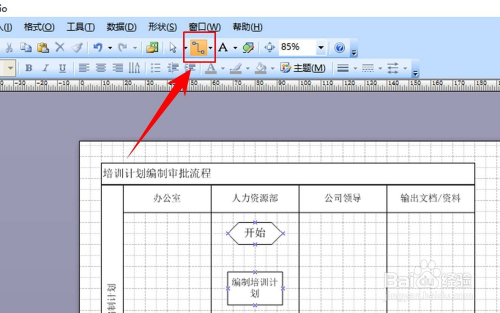 有时我们会边画流程图边连线,连线功能启动后,其并不会主动消逝,点击图示位置的箭头符号,就可以打消连线功能,继续在画布中添加图形。