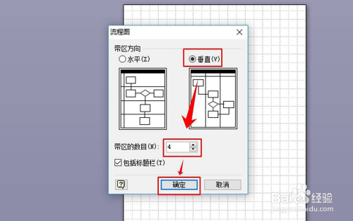 点击“确定”后,页面就会跳转至带区偏向选择页面,软件默认的是程度偏向,可是在职场中比力常用的是垂直体例,我在这里选择【垂直】,然后鄙人面图示位置的调整带区的数目(按照我们要设计的流程图中涉及的部分数目确定)。