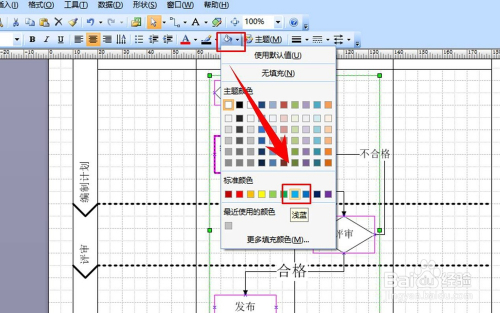 为了让流程图显得加倍的夺目、美不雅,加倍具有可阅读性,我们还需要对流程图中的图形进行填充颜色。点击鼠标左键,然后在东西栏中点击油漆桶图形的图标,然后在其下拉列表中选择一种颜色,那么这个被选中的图形就会主动被填充为该颜色了。