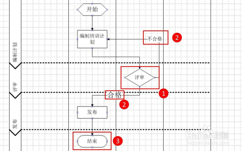 为了展示一个完整的流程图,我们继续添加其他的图形,图示1位置是常用的鉴定符号,其这个符号应该有一个输入端,两个出端。颠末鉴定为真毗连一个输出端,鉴定为假则又会毗连另一个输出端。为了区分这两个输出端,一般会在线条上标识表记标帜响应的前提(图示2位置,双击连线就可以添加文字)。图示3位置是我们的竣事符号