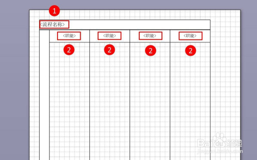 选定好点取偏向,并设置好带区数目后,在画布上就会主动生当作一个如图所示的流程图模板,用鼠标在图示位置1进行双击,就可以在此位置输入流程图的名称;在图示2位置用同样的方式就可以输入部分的名称。