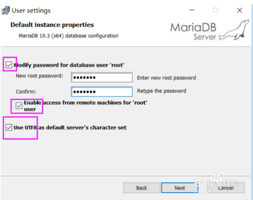 安装MariaDB,选中左边三个框,设置root用户初始密码demo!@# 这个密码后面也可以点窜,下一步会用到这个密码,如下图所示:
