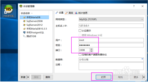 MariaDB安装完当作后,里面已经包含了HeidiSql数据库办理东西,在桌面上点击快捷体例HeidiSql,【会话办理器】新建一个毗连,输入端3308,输入root用户的初始密码,就是上一步安装时设置的初始密码demo!@# ,如下图所示: