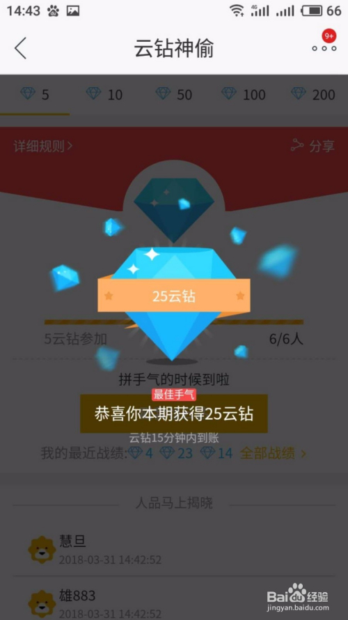点击云钻神偷,有一次免费的机遇哦,只要天天打卡都可以或许获得一次免费的机遇,点击5云咱介入,然后再点击戳我领云钻,有几多看命运咯,起码1,最多25,小编命运不错,25个云钻哦。
