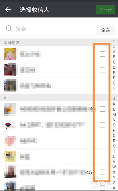 想发给谁就点击后面的小方块,打上对勾,再点击右上角“下一步”。编纂好动静就可以发送了。