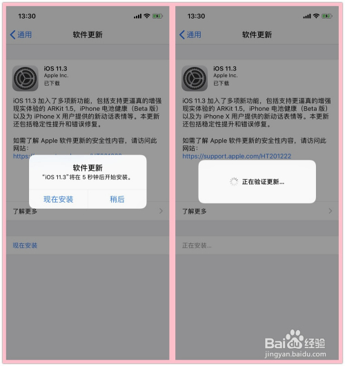 新的软件下载完当作后就可以进行安装了——验证更新——手机遇黑屏一下,然后呈现苹果标记,期待安装完当作便会主动启脱手机。