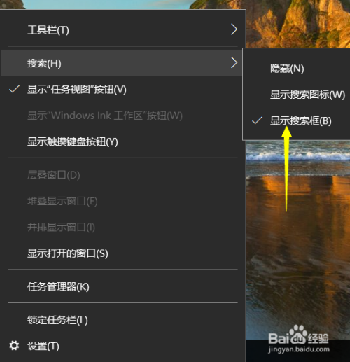 若是是win10系统的话可以直接鼠标右击使命栏按照下图依次显示搜刮图标,直接搜刮显示设置即可。