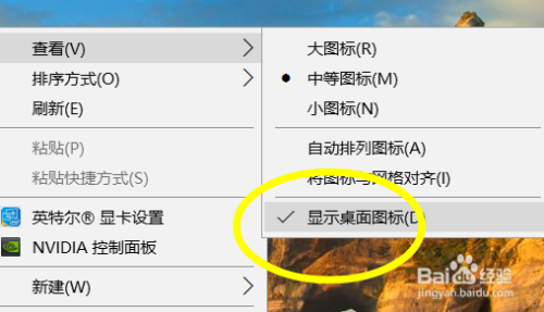 点击显示之后依次点击查看下的显示桌面图标看看有没有被勾选上。