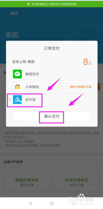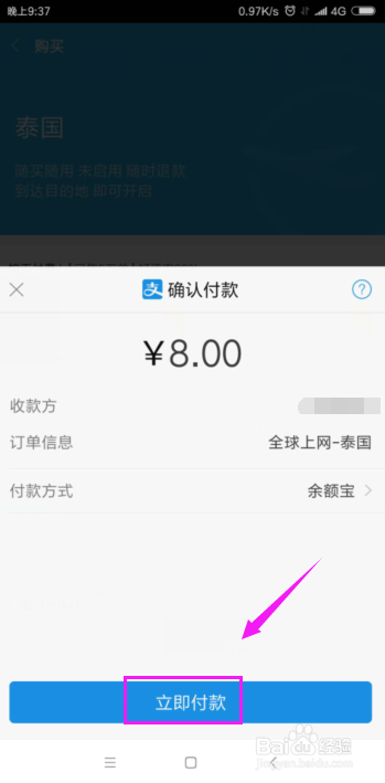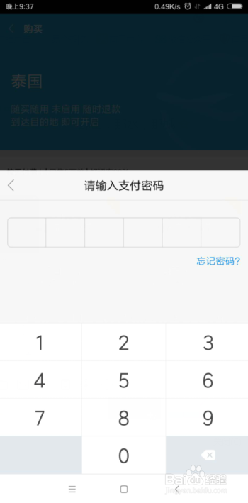 最后,就会来到我们的付出宝付出界面,在付出宝付出界面,我们输入我们本身的付出宝密码,付出当作功,我们到了泰国,就可以同样的利用流量上网了。