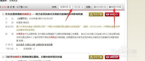 我们搜刮到数据还可以按照相关度或者颁发时候进行排序,也可以选择显示简文列表或题目列表。