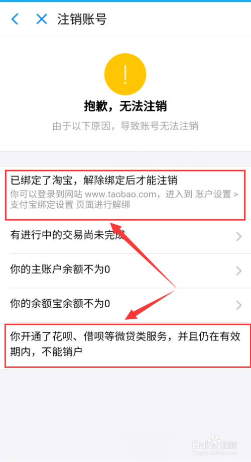 这里我们可以看到,若是你的付出宝绑定了淘宝或者开通了花呗、借呗等是无法刊出的,所以你得先去解绑,再来进行刊出。