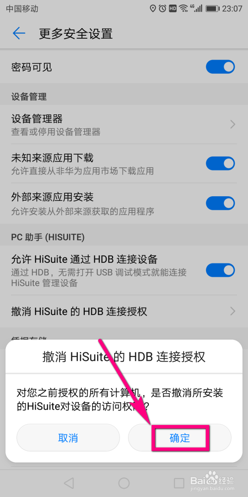 此时就会在屏幕的下方弹出一个“撤销HiSuite的HDB毗连权限”的信息扣问界面,在界面下方点击【确定】,如许就完当作了。