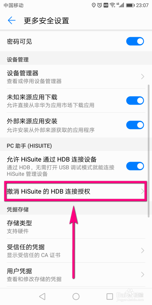 然后就跳转至该页面了,在页面的列表中找到并点击【撤销HiSuite的HDB毗连权限】的选项。