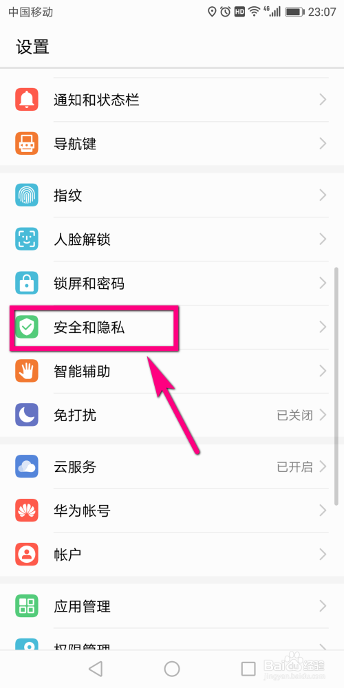 往下拖动屏幕的时辰,同时查看屏幕上是否有【平安与隐私】的设置选项,找到后点击该选项进入。