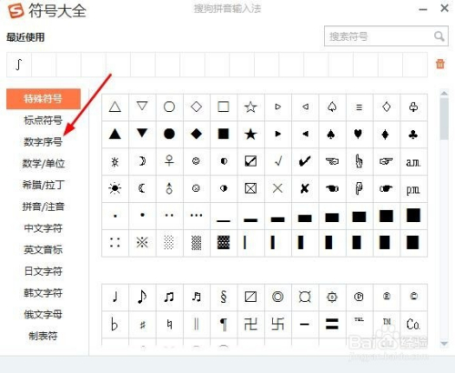 在符号年夜全中,我们可以看到左边菜单栏稀有字序号,我们点击它