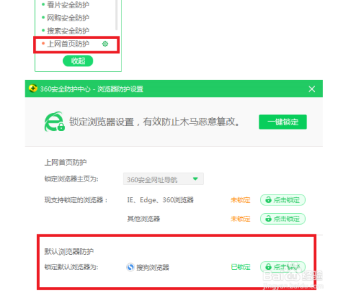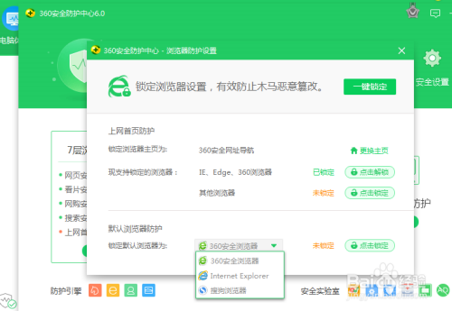 点击下拉小箭头可以选择需要设置的浏览器,点击右侧的点击锁定即可当作功锁定新的默认浏览器。