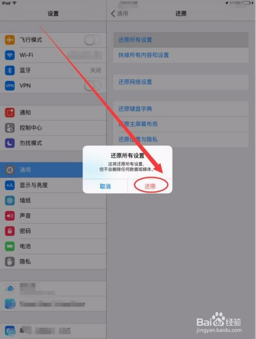 呈现“还原所有设置”对话框后,点击“还原”按钮,接下来就可以使ipad恢复到出厂设置了。
