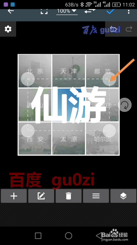 这时文字就会呈现在图片上,但因为分辩率的问题,大小并不合适,可经由过程4个角落进行缩放,也可以扭转,