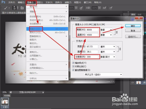 那么很较着,此刻我们就可以更改分辩率这个数值,让我们可以本身调高或调低图片分辩率,我们先调高图片分辩率试下结果,在输入框中点窜96dpi为300dpi,这个时辰我们会发现上方的像素大小宽度和高度也发生了转变,如许是不可的,我们需要将宽度和高度点窜回宽度2560像素,高度1440像素。