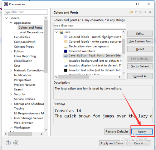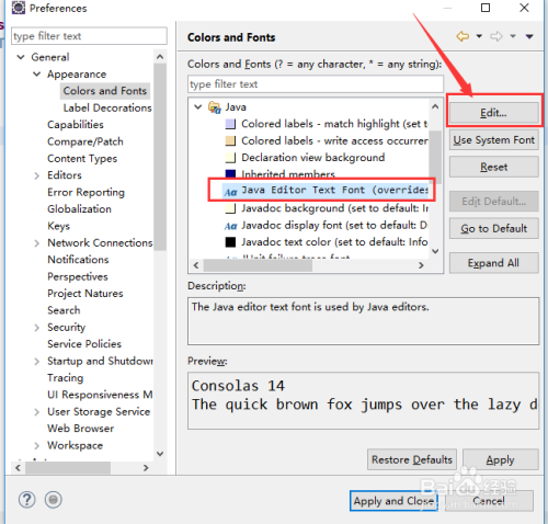 第六步:在第五步睁开成果中,选中“Java Editor Text Font”,并单击“编纂”,点窜完单击确定,最后应用