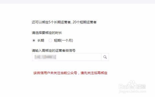 我们输入后点击搜刮后,会提醒“该微信用户未存眷当前公家号,请先存眷后再绑定”,所以我们在添加绑定之前要存眷公家号,才可以操作步调6。