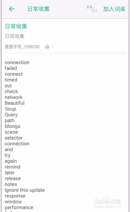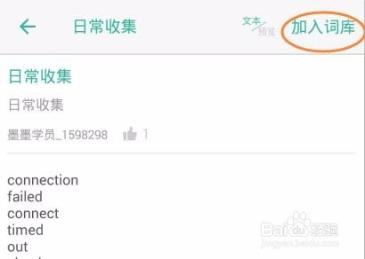 点击此中一个词库,例如“日常收集”,预览单词列表,点击“插手词库”,在“我的词库”中,发现词库又增添一个