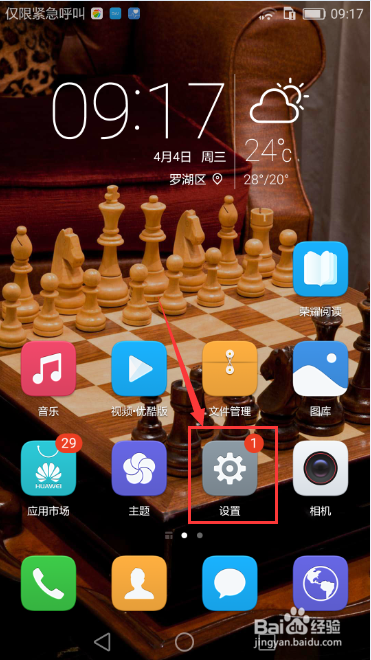 小编这里利用的是华为荣耀手机做测试。首先我们来看下桌面。在桌面上可以看到“设置”,我们点击进入