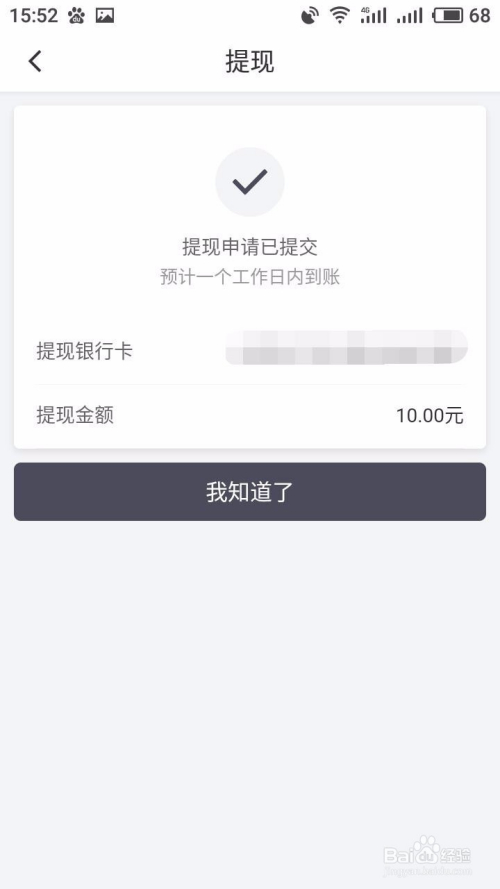 弹出提现申请已提交壤面,一般一个工作日内就可以到账,返回查看余额信息,少了10块钱