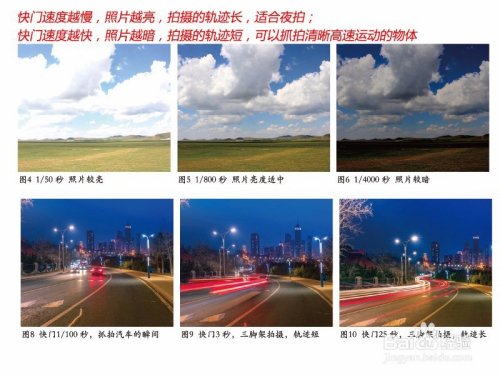 快门速度越慢,照片越亮,拍摄的轨迹长,适合夜拍;快门速度越快,照片越暗,拍摄的轨迹短,可以抓拍清楚高速活动的物体