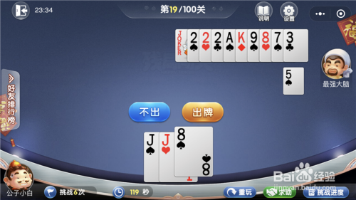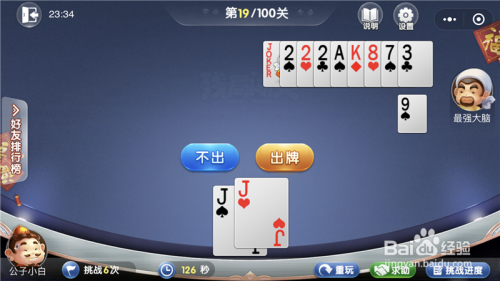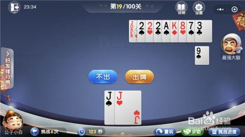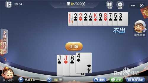 微信欢喜斗地主残局闯关4月第19关攻略,这一关的重点在于对方的牌很年夜,我们需要最快速的耗损失落对方的3个2和年夜王,那么如何操作呢?小白就告诉大师微信欢喜斗地主残局闯关4月第19关攻略