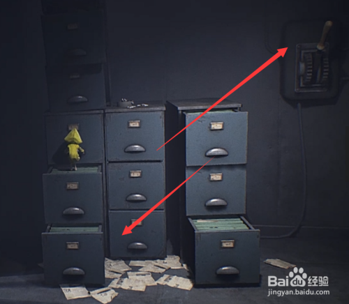 打开左边的箱子,就可以爬到文件箱的最上面,挑起来把电闸关了。