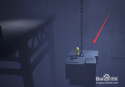 把箱子往右边推,推到右边后往里面跳,再沿着里面进行爬格子,再沿着锁链标的目的上爬。然后去拉电闸,把箱子抬上来。