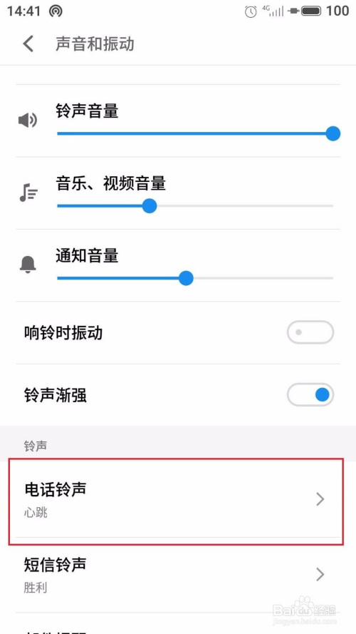 第七步:勾选该当地音乐后再次回到声音和振动界面,如下图所示,会发现德律风铃声已经改换当作我们喜好的歌曲了。