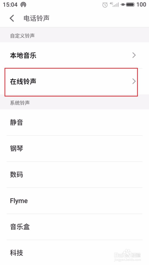 第八步:当我们想直接在收集上查找本身喜好的歌曲设为德律风铃声的话,在德律风铃声界面中点击在线铃声,如下图所示。