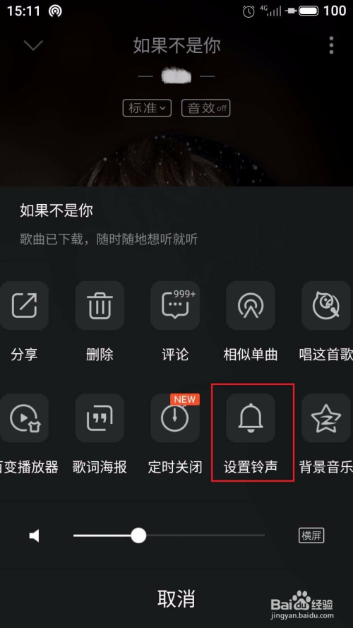 别的,设置德律风铃声还可以直接在音乐播放器中设置,如下图所示,找到歌曲,点击红色框中的设置铃声即可完当作铃声设置。